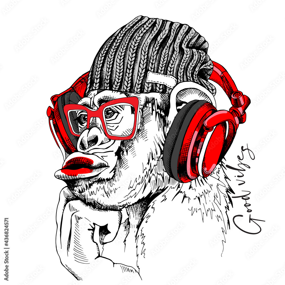 Obraz Śmieszna małpa w hipsterskiej czapce z dzianiny, w okularach i czerwonych słuchawkach. Dobre wibracje - cytat z napisem. Śmieszne obrazy zwierząt - ilustracje w zabawnym wydaniu humorystycznym. Śmieszne obrazy zachwycają nie tylko dzieci i nastolatków a także dorosłych, zabawne obrazy w sypialniach nastolatków to sposób na przyjazną atmosferę uśmiech i relaks. Odkryj najpiękniejsze i najbardziej inspirujące ilustracje zwierząt, które można kupić online w formie obrazu na płótnie lub plakatu.