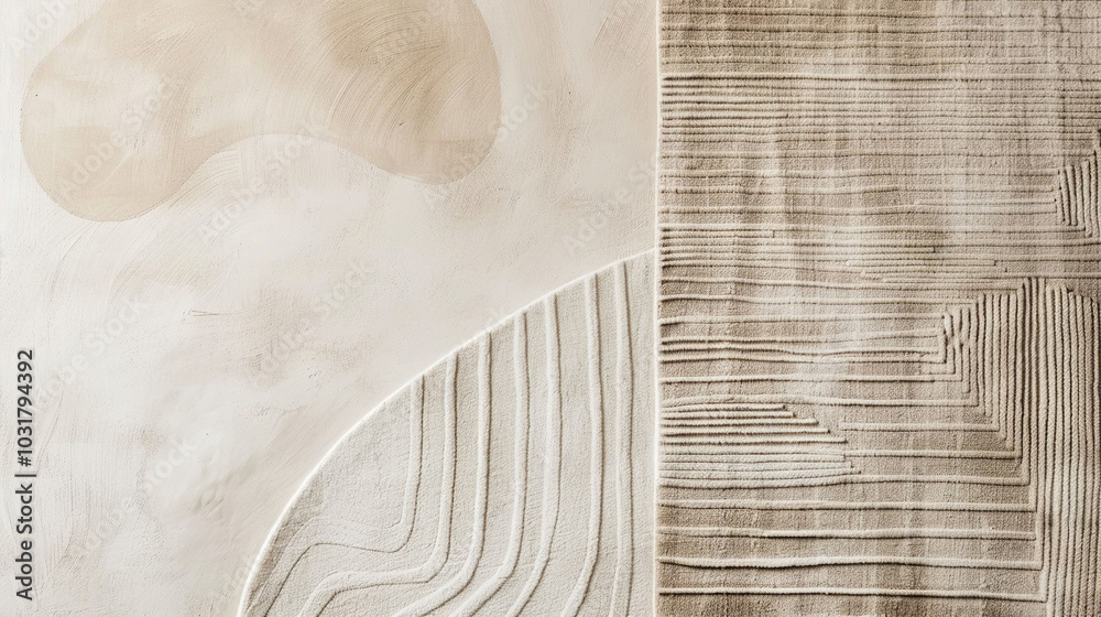 Beige wall with a pattern of lines and curves, white and brown colors, beige tone, minimalist... #1031794392