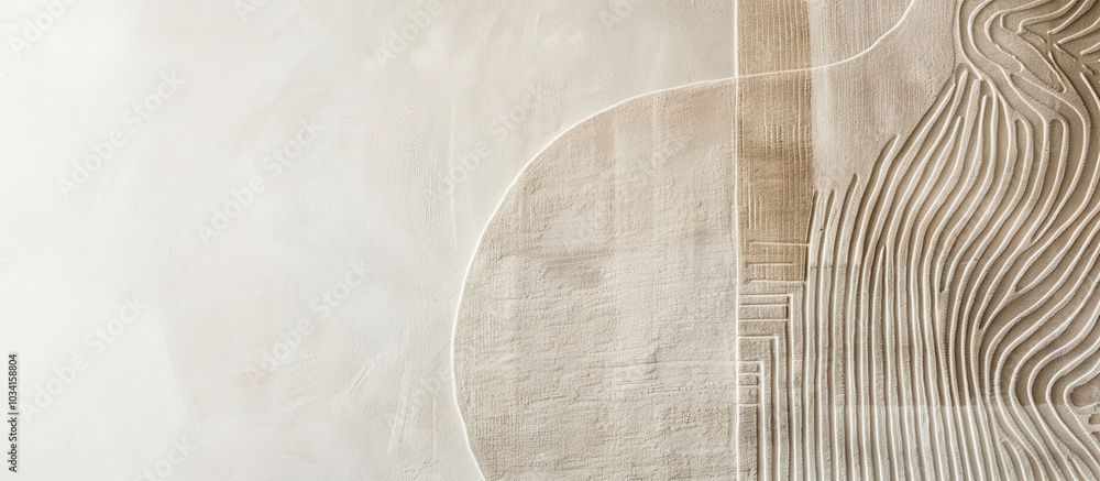 Beige wall with a pattern of lines and curves, white and brown colors, beige tone, minimalist... #1034158804