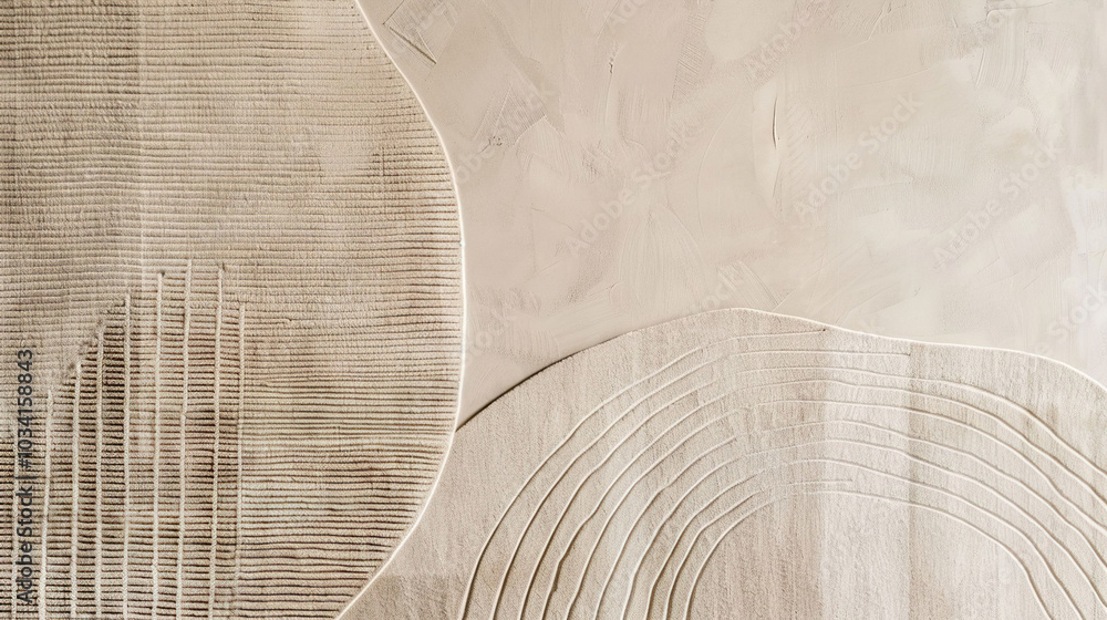 Beige wall with a pattern of lines and curves, white and brown colors, beige tone, minimalist... #1034158843
