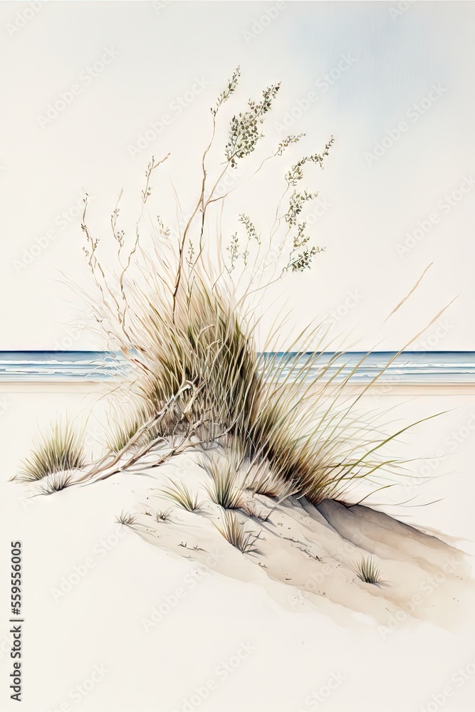 Obraz nadmorskie wydmy, trawa plażowa, piasek, spokojny ocean, akwarela, obraz marynistyczny w minimalistycznym stylu.
