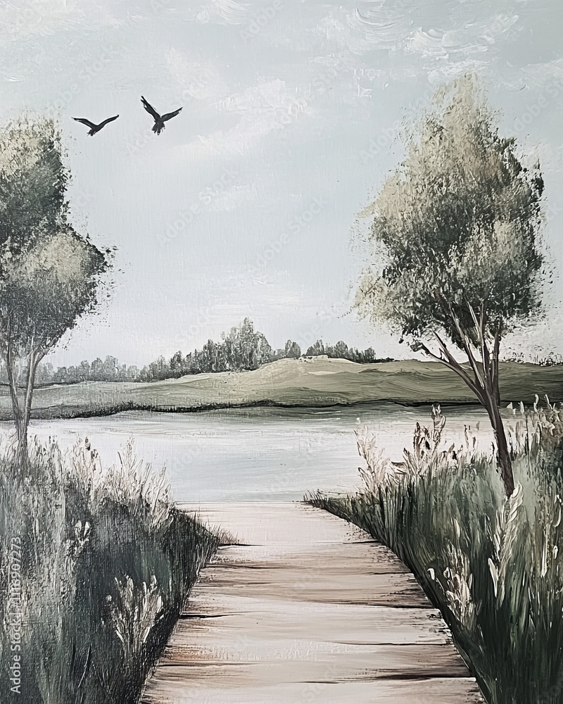 Boardwalk to lake, beautiful vintage oil painting #1116907273