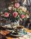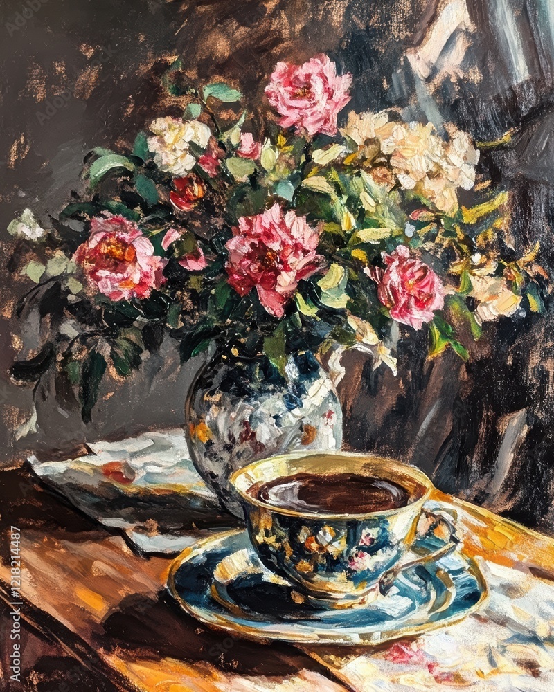 Vintage flowers in vase next to tea art painting, wall art, design, realistic, textured painting #1218214487