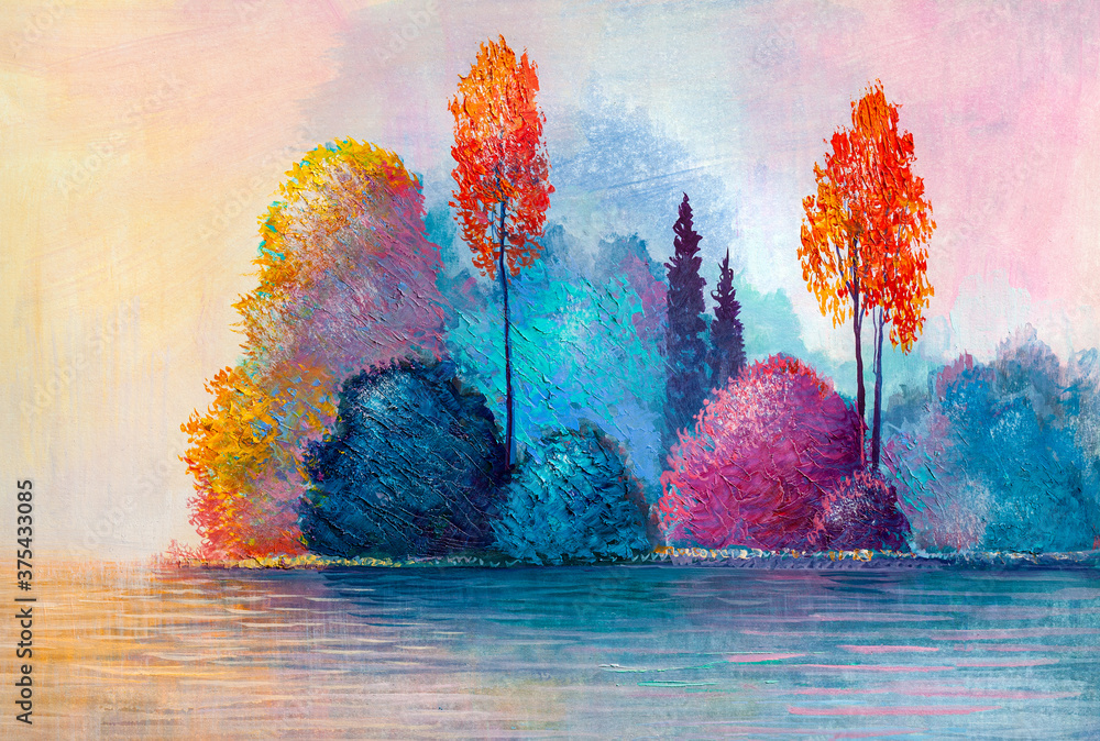 Oil painting landscape, autumn forest near the river, colorful autumn trees. impressionism art. #375433085