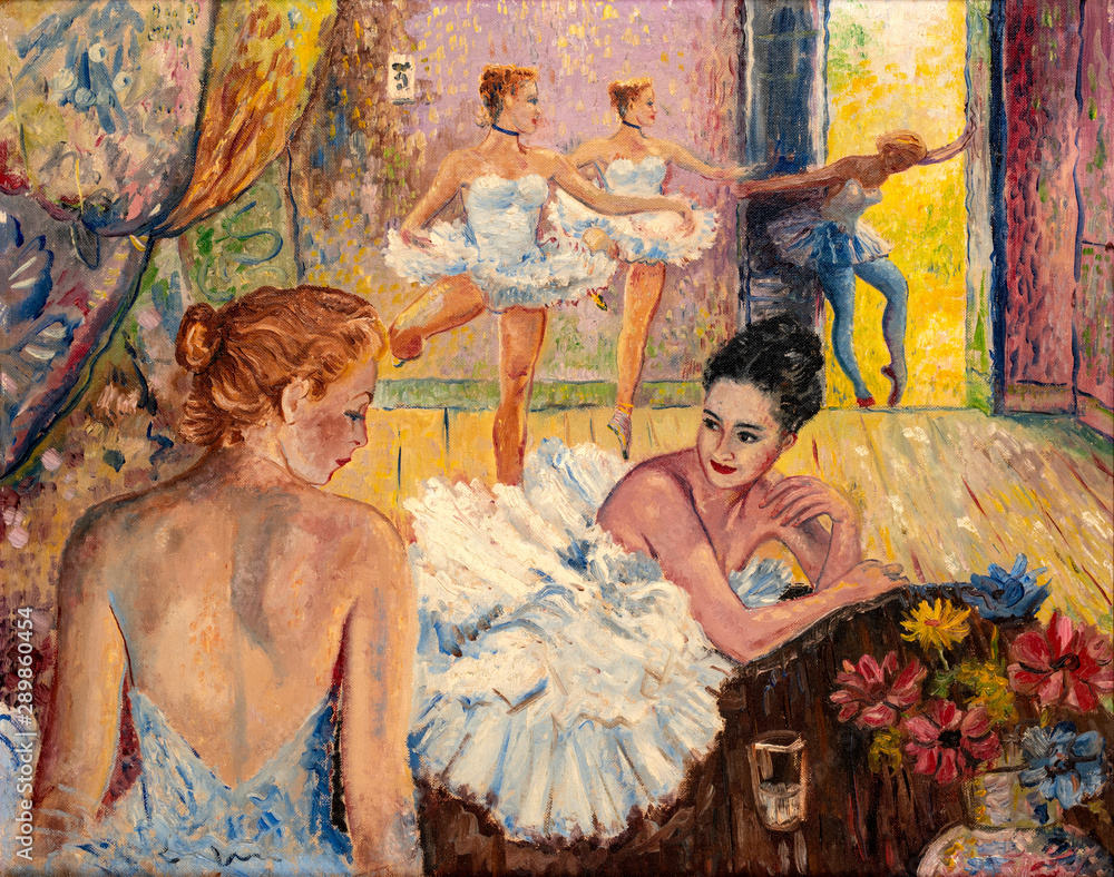 Reprodukcja Oryginalnego obrazu olejnego Młodych Baletnic ubranych w spódniczki tutu w ich pracowni. Wystarczy bowiem zamówić drukowany Obraz Canvas lub fotograficzny Plakat z motywem artystycznego malarstwa i uchwycić ducha czasu, przedmiot, zjawisko w nowoczesnym wydaniu. Wysublimowane modernistyczne piękno, artystyczny charakter zyskasz dekorując przestrzeń niepowtarzalnymi dekoracjami ściennymi. Zainspiruj się reprodukcją Sztuki, Malarstwa, przedstaw swoje wnętrze domu w nowym obliczu, baw się kolorem i formą, w tym właśnie tkwi sztuka tworzenia pięknych wnętrz.