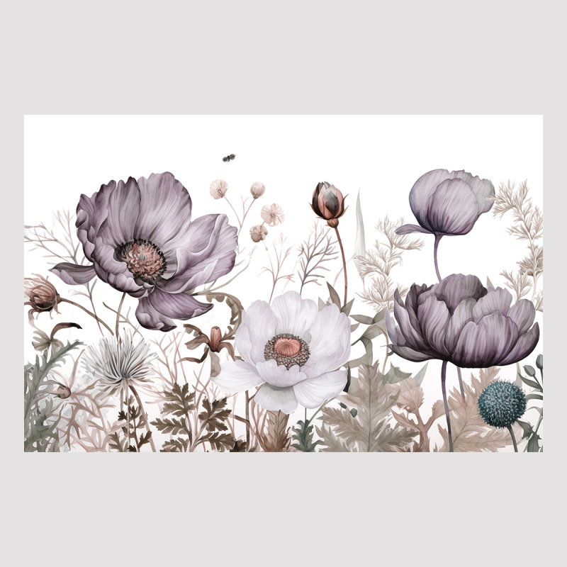 Ta wyjątkowa tapeta to prawdziwa oda do natury, łącząca subtelność roślinnych wzorów z delikatną nutą tajemniczości. Malarskie, ręcznie ilustrowane kwiaty w odcieniach przygaszonej lawendy, kremowej bieli, stonowanego beżu oraz zgaszonej zieleni tworzą harmonijną, botaniczną kompozycję, idealnie wpisującą się w styl romantyczny, rustykalny, vintage oraz nowoczesny minimalizm.