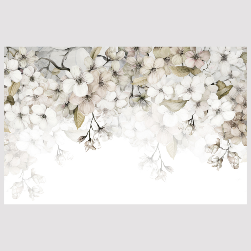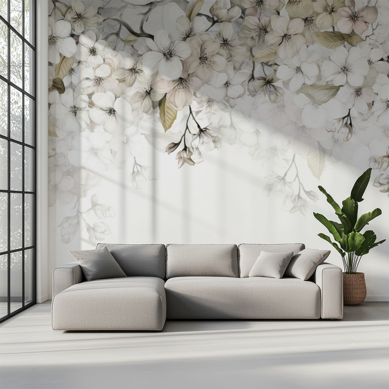 Wyjątkowo realistyczne detale sprawiają, że jest to również niezwykle delikatna tapeta ścienna, idealna do mniejszych przestrzeni, które pragniesz optycznie powiększyć i rozjaśnić. Z kolei zastosowanie białych, kremowych i różanych kwiatów czyni ją idealną jako tapeta z białymi kwiatami, która rozświetli wnętrze. Motyw liści, pąków i łodyg doskonale oddaje naturalny charakter kompozycji, dzięki czemu może być z powodzeniem stosowana jako tapeta z motywem roślinnym oraz tapeta z liśćmi i kwiatami.
