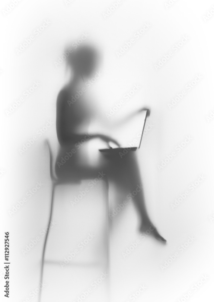 Silhouette, slim woman sits with laptop computer #112927546