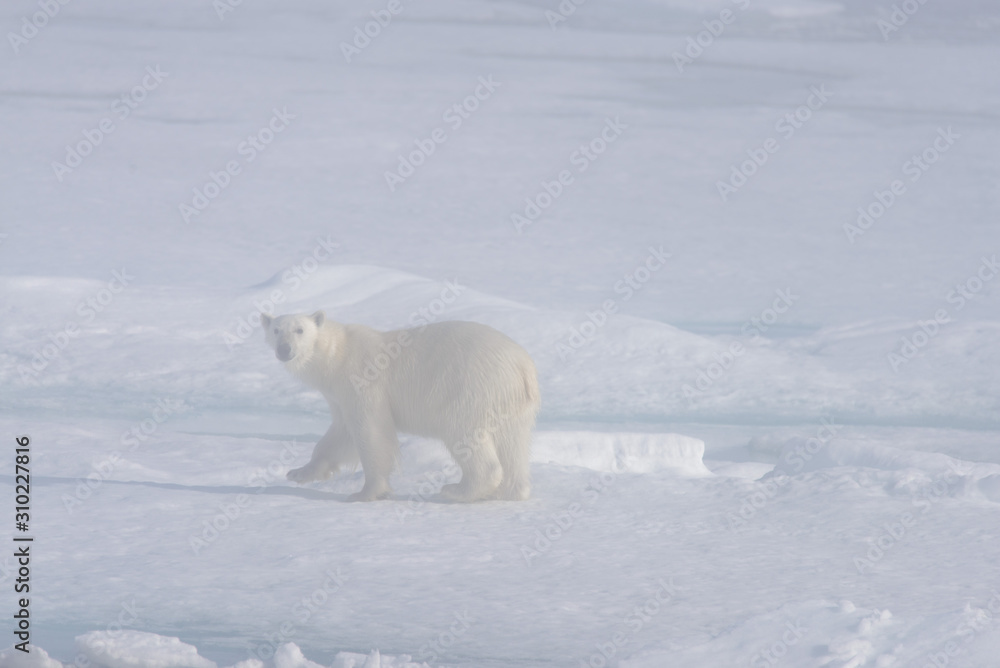Polar bear (Ursus maritimus) on the pack ice in fog #310227816