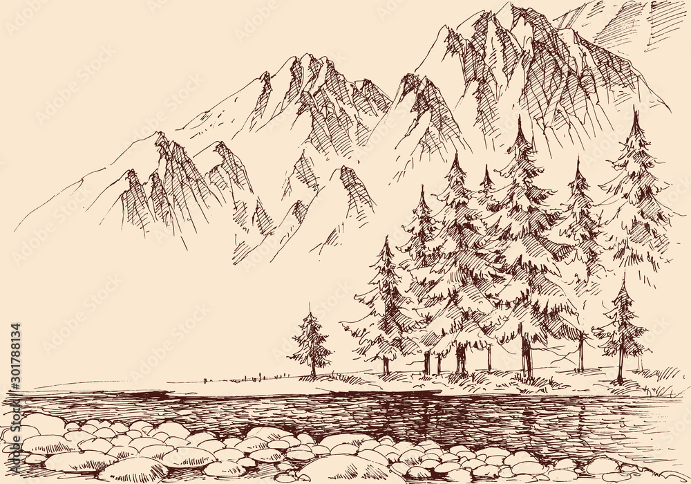 River flow in the mountains, pine trees forest hand drawing #301788134