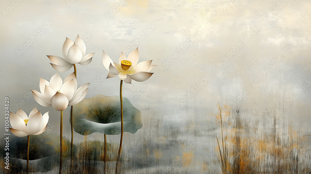 An elegant Chinese landscape painting of a lotus pond, created on Xuan paper with an off-white... #1004324829