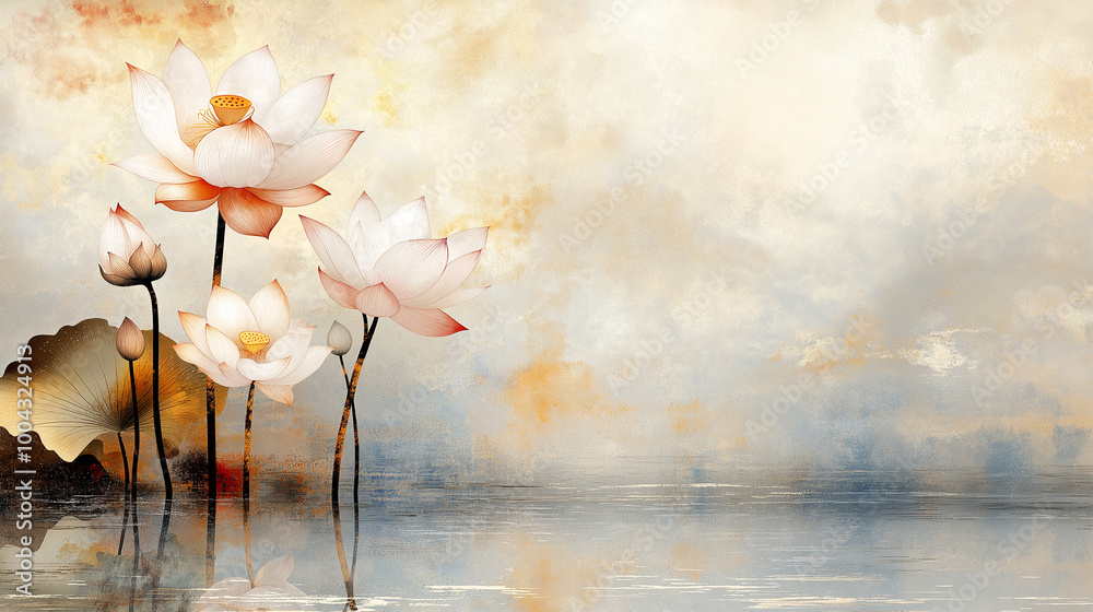 An elegant Chinese landscape painting of a lotus pond, created on Xuan paper with an off-white... #1004324913
