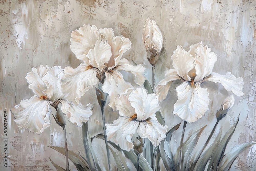 Vintage painting of white irises in the garden, vintage art print, white background, generated... #806376315