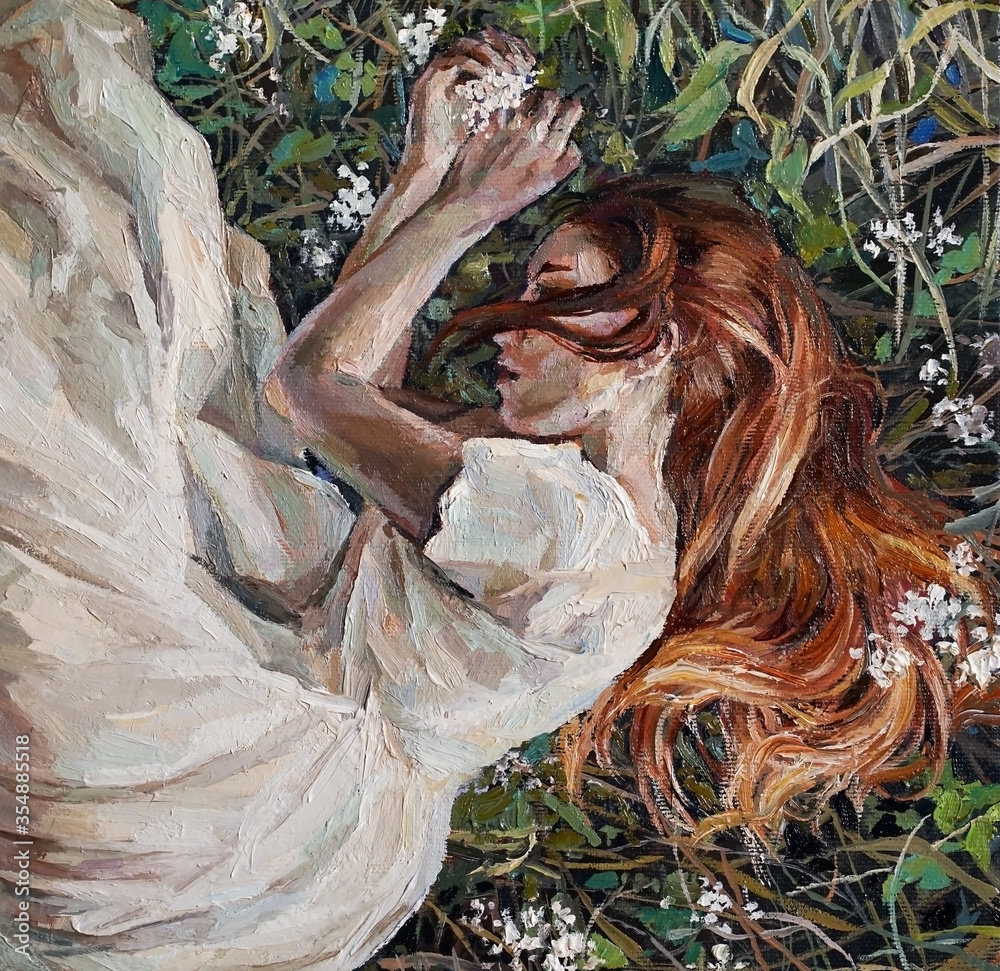 Reprodukcja Oryginalnego obrazu olejnego Rudowłosa piękność, młoda dziewczyna śpi i śni na polu wśród różnych letnich ziół i dzikich kwiatów. Obraz olejny na płótnie. Wystarczy bowiem zamówić drukowany Obraz Canvas lub fotograficzny Plakat z motywem artystycznego malarstwa i uchwycić ducha czasu, przedmiot, zjawisko w nowoczesnym wydaniu. Wysublimowane modernistyczne piękno, artystyczny charakter zyskasz dekorując przestrzeń niepowtarzalnymi dekoracjami ściennymi. Zainspiruj się reprodukcją Sztuki, Malarstwa, przedstaw swoje wnętrze domu w nowym obliczu, baw się kolorem i formą, w tym właśnie tkwi sztuka tworzenia pięknych wnętrz.
