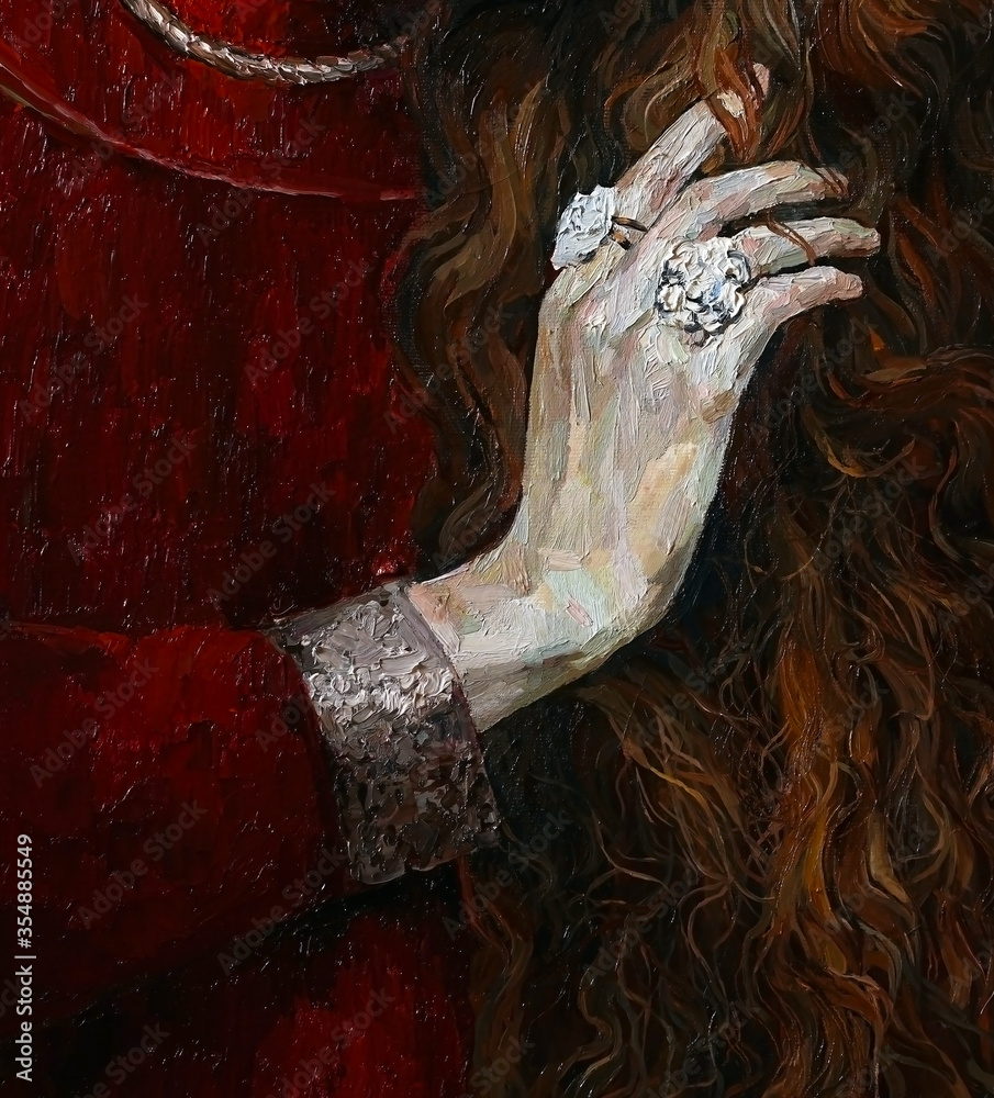 Reprodukcja Oryginalnego obrazu olejnego Blada dłoń z luksusowymi srebrnymi pierścieniami na ciemnym bordowym tle. Młoda kobieta czesze kosmyki swoich długich rudych włosów. Wykonany w stylu klasycznym fragment obrazu olejnego na płótnie. Wystarczy bowiem zamówić drukowany Obraz Canvas lub fotograficzny Plakat z motywem artystycznego malarstwa i uchwycić ducha czasu, przedmiot, zjawisko w nowoczesnym wydaniu. Wysublimowane modernistyczne piękno, artystyczny charakter zyskasz dekorując przestrzeń niepowtarzalnymi dekoracjami ściennymi. Zainspiruj się reprodukcją Sztuki, Malarstwa, przedstaw swoje wnętrze domu w nowym obliczu, baw się kolorem i formą, w tym właśnie tkwi sztuka tworzenia pięknych wnętrz.