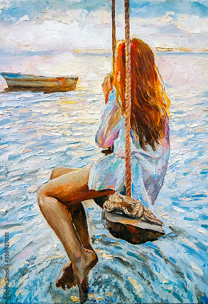 Reprodukcja Oryginalnego obrazu olejnego Młoda rudowłosa dziewczyna buja się na huśtawce i ogląda zachód słońca nad oceanem. W tle pływa łódź rybacka. Spokojny krajobraz stworzony pociągnięciami pędzla, obraz olejny na płótnie. Wystarczy bowiem zamówić drukowany Obraz Canvas lub fotograficzny Plakat z motywem artystycznego malarstwa i uchwycić ducha czasu, przedmiot, zjawisko w nowoczesnym wydaniu. Wysublimowane modernistyczne piękno, artystyczny charakter zyskasz dekorując przestrzeń niepowtarzalnymi dekoracjami ściennymi. Zainspiruj się reprodukcją Sztuki, Malarstwa, przedstaw swoje wnętrze domu w nowym obliczu, baw się kolorem i formą, w tym właśnie tkwi sztuka tworzenia pięknych wnętrz.