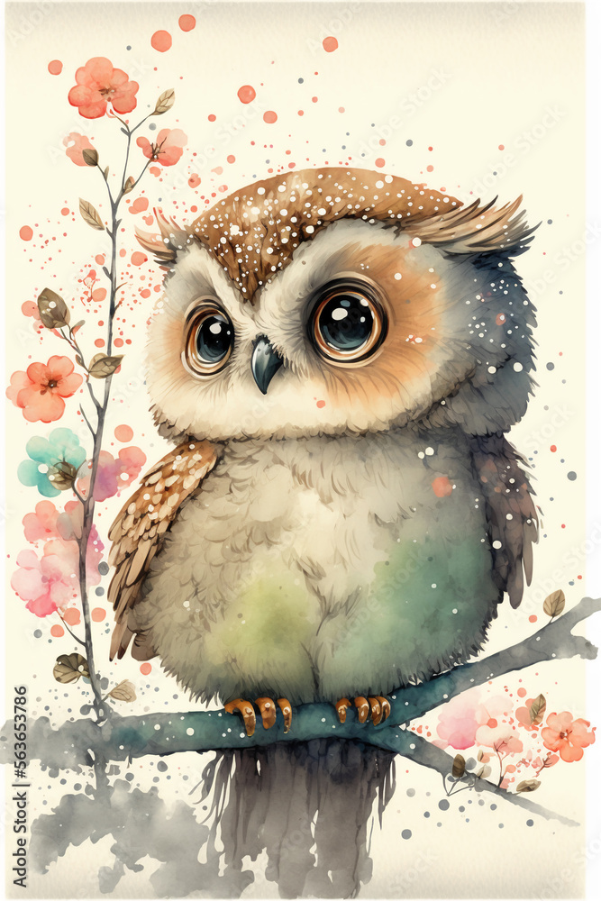 Obraz z Sową, ilustracja dla dzieci, piękna dekoracja na ścianę do pokoju dziecięcego. Obraz na płótnie, Plakat, Ilustracja do pokoju dziecka.