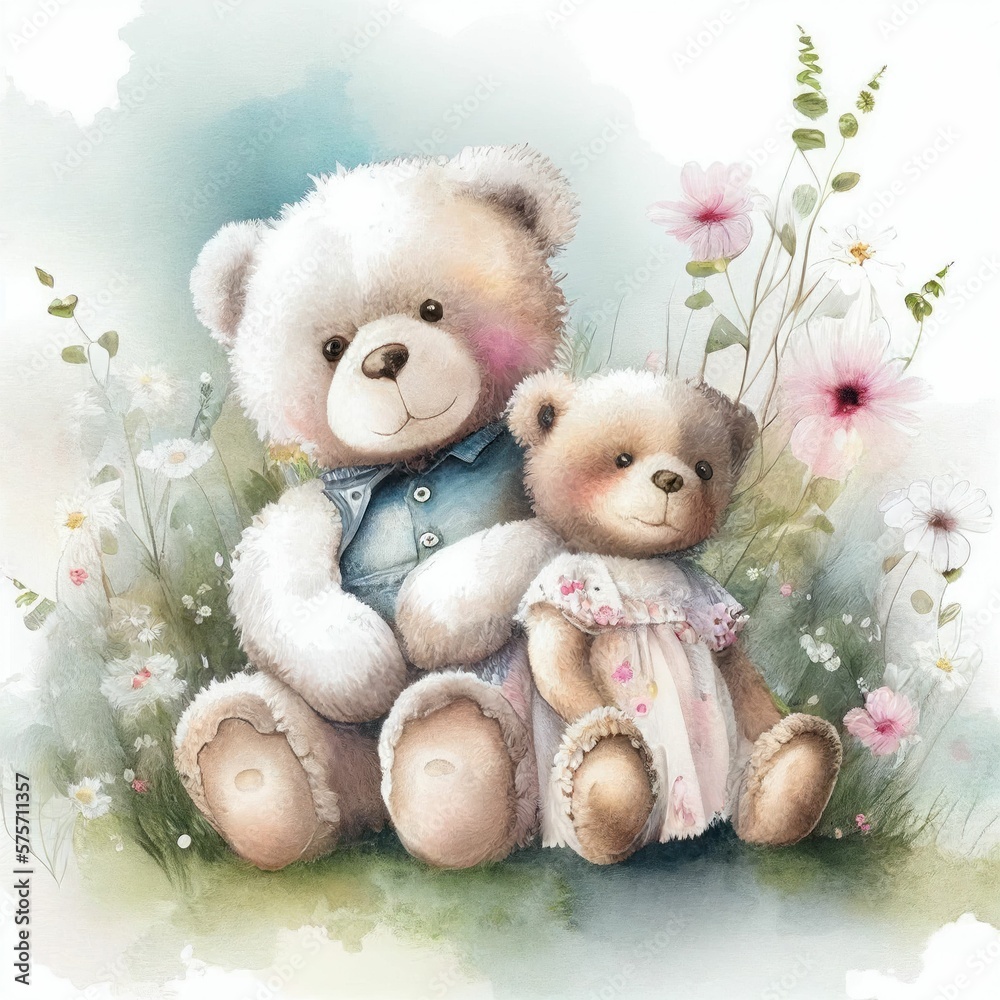 Ilustracja dwa pluszowe misie siedzące razem w ogrodzie kwiatowym. Obraz na płótnie, Plakat, Ilustracja do pokoju dziecięcego.