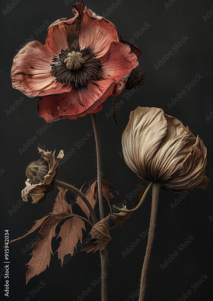 To dzieło sztuki uchwyca delikatne piękno wysuszonych kwiatów, prezentując ich złożoną teksturę i subtelną paletę kolorów. Ciepłe odcienie czerwieni, beżu, złota oraz pastelowe tony podkreślają naturalną elegancję roślin, tworząc atmosferę spokojnej harmonii. Wysoka precyzja ukazania każdego detalu płatków i łodyg uwydatnia cichy majestat tych roślin, czyniąc obraz idealnym dodatkiem do eleganckiego salonu. Wydrukowany na wysokiej jakości płótnie bawełnianym, obraz doskonale wpasowuje się w minimalistyczne lub inspirowane naturą wnętrza. To perfekcyjny wybór dla osób ceniących organiczne piękno i subtelną estetykę, doskonale komponujący się z nowoczesnym stylem życia.