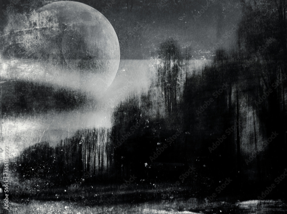 Scary night landscape with forest and full moon, horror wallpaper #355163992