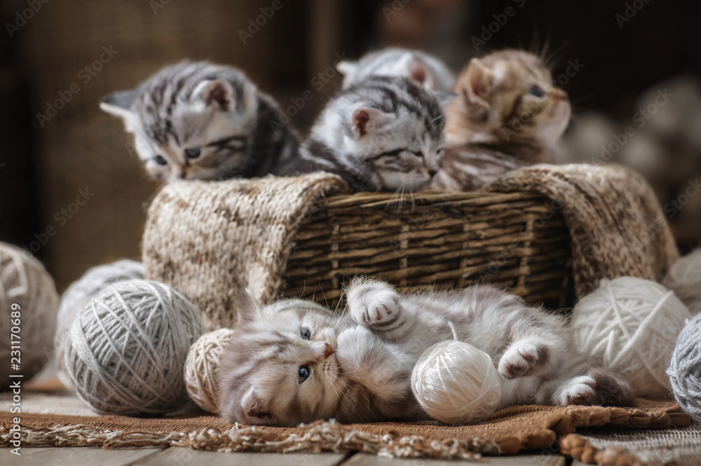 Small striped kitten in the old basket #231170689