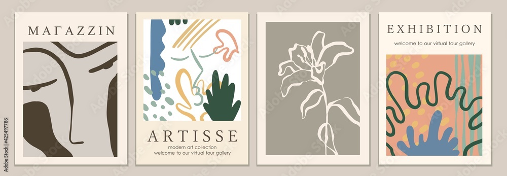 Abstrakcyjna kolekcja plakatów ściennych. Zestaw czterech plakatów na ścianę z napisami w minimalistycznym stylu. Skandynawskie Ilustracje, abstrakcyjne kształty i napisy. Zestaw plakatów nowoczesnych - sztuka współczesna. Abstrakcyjna sztuka ścienna. Obraz na płótnie lub plakat w formie Tryptyku w rozmiarze 50/70 cm to nowoczesny zestaw dekoracyjny na ścianę.