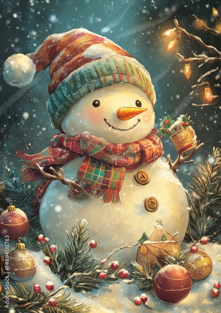Cheerful Snowman Surrounded by Christmas Ornaments in Winter Scene #1469400763