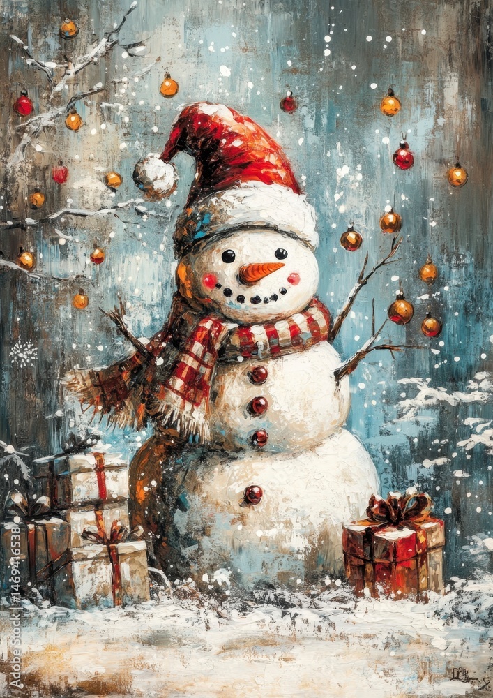 Cheerful Snowman with Gifts and Decorations in Winter Wonderland Scene #1469416538