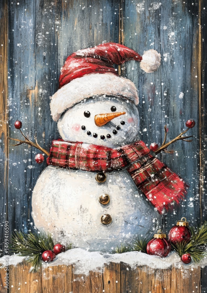 Cheerful Snowman in Winter Scene with Red Hat and Scarf #1469416590