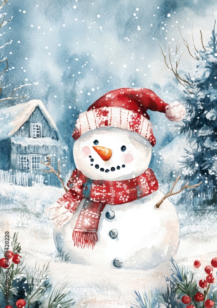 Cheerful Snowman in Winter Wonderland with Snowflakes and Cabin #1469420220
