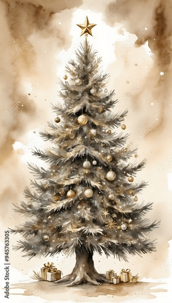 Aquarell - Geschmückter Weihnachtsbaum - sepia #945763305