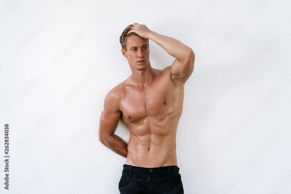 Sexy athletic man with naked torso on white background. Fashion portrait of sporty healthy guy #262834038