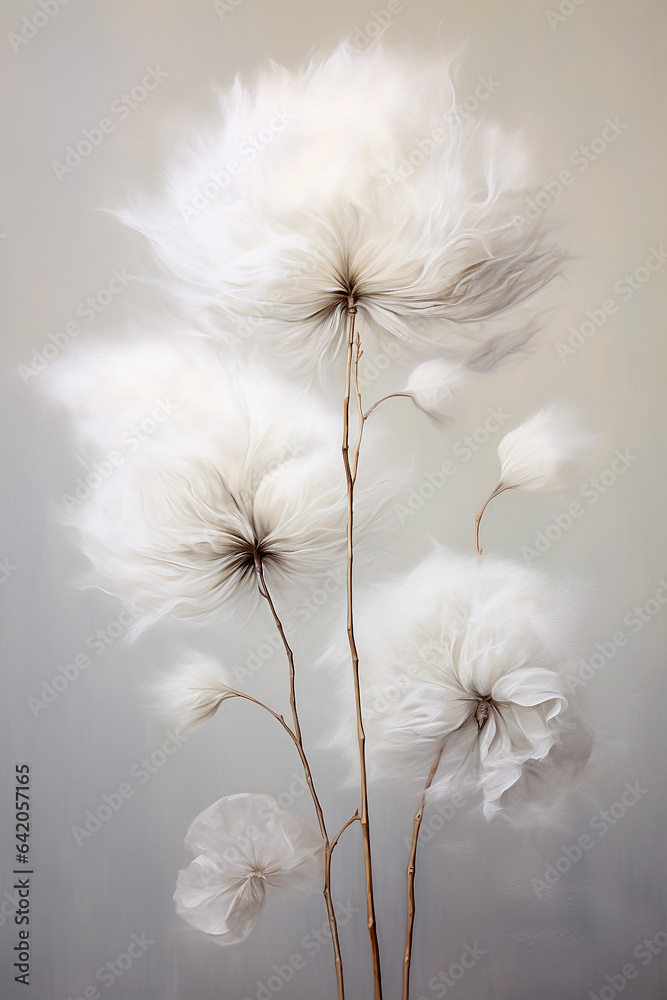 Minimalistyczny plakat botaniczny lub elegancki obraz canvas przedstawiający białe suszone kwiaty o delikatnej, puszystej strukturze na jasnym, neutralnym tle. Ta subtelna dekoracja ścienna inspirowana naturą doskonale wpisuje się w estetykę minimalizmu, stylu skandynawskiego, boho oraz japandi.