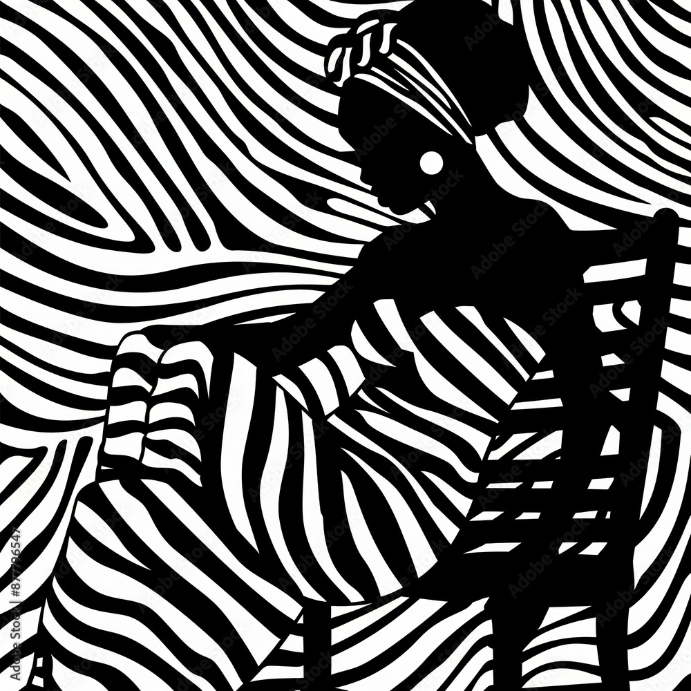 A woman in a chair sits against a black and white zebra stripe background #877796547