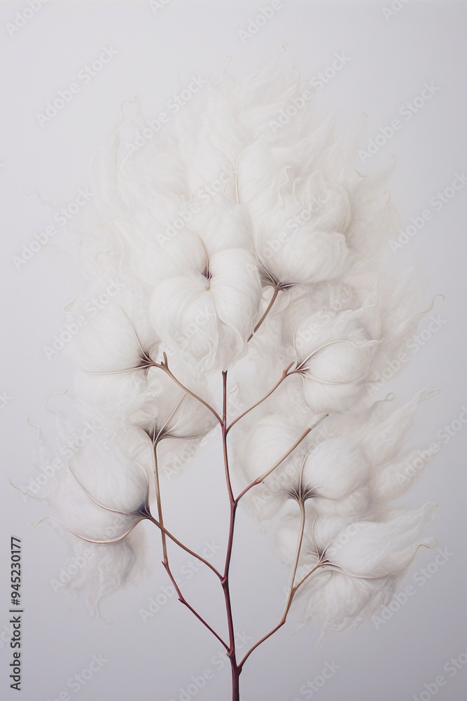 Elegancki, minimalistyczny plakat botaniczny przedstawiający delikatną gałązkę bawełny o puszystych, białych kwiatach na jasnym, neutralnym tle. Subtelna kolorystyka w odcieniach bieli i beżu podkreśla lekkość, naturalność i harmonię kompozycji. To idealny obraz canvas do wnętrz urządzonych w stylu skandynawskim, boho, japandi, minimalistycznym oraz nowoczesnym.