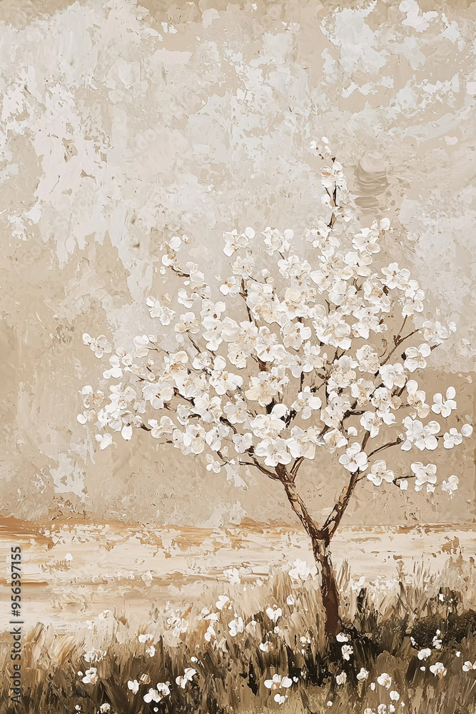 Painting of a cherry tree with white flowers on grunge background. Printable vertical wall art in... #956397155