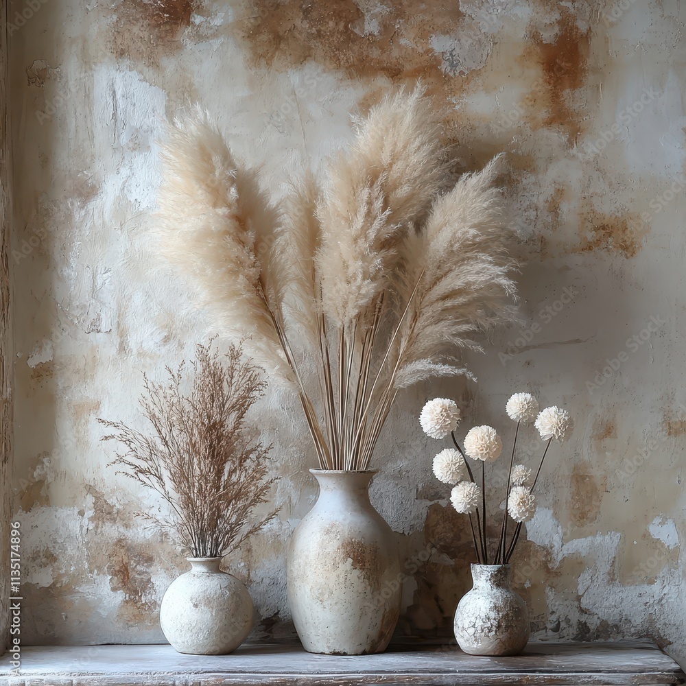 Earthy Still Life with Pampas Grass and Dried Flowers in Rustic Vases Against Textured Wall. #1135174896