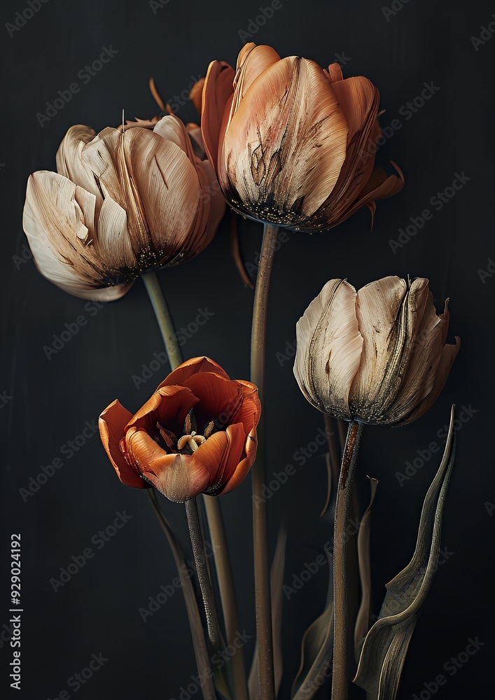 Obraz przedstawia cztery tulipany o pomarańczowo-białych płatkach na czarnym tle, co nadaje kompozycji elegancki i dramatyczny wygląd. Delikatne płatki kwiatów, w różnym stopniu rozkwitu, kontrastują z głęboką czernią tła, co podkreśla ich żywe kolory. Pomarańczowe i białe odcienie płatków tworzą harmonijną kombinację, przyciągając wzrok. Minimalistyczna stylistyka sprawia, że obraz idealnie pasuje do nowoczesnych projektów graficznych, stron internetowych o tematyce florystycznej oraz dekoracji wnętrz, dodając elegancji i subtelnego piękna.