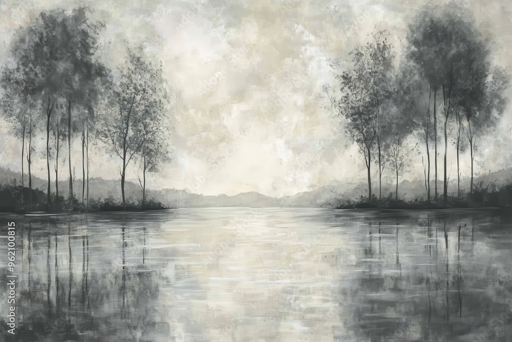 Abstract Gray Landscape with Trees and Still Water #962100815