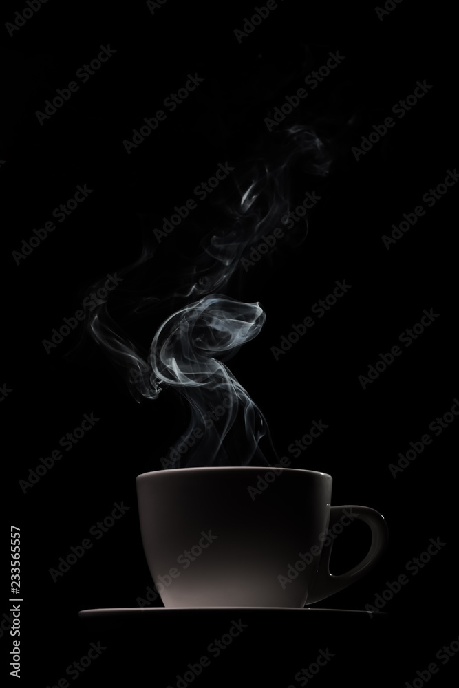 Fragrant coffee on a black background for your advertising. Smoke from hot coffee. #233565557