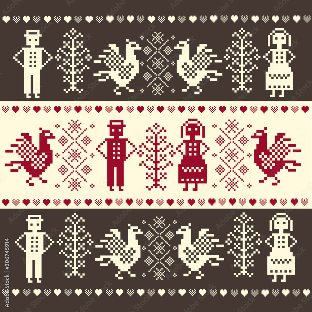 Polish fabric pattern inspired by Podlasie folk art - a pattern with people, birds on a red... #306745914