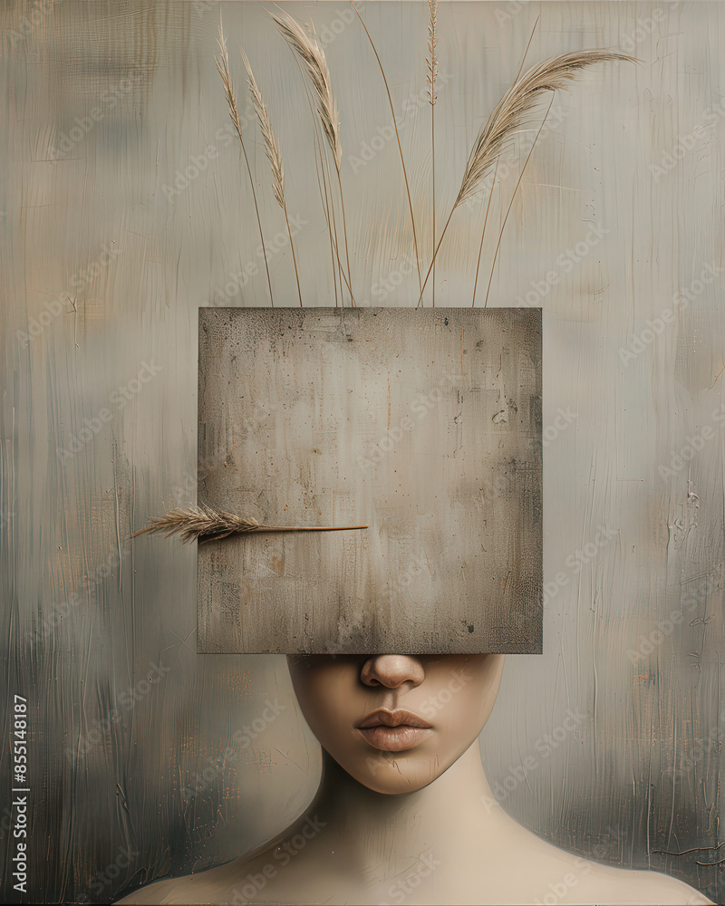 Abstrakcyjna sztuka neo-surrealistyczna przedstawiająca eteryczną twarz kobiety połączoną z elementami natury. Obraz łączy odważną pomarańczową słońce z delikatnymi pociągnięciami trawy, tworząc harmonijną kompozycję. Inspirowana japońską sztuką, całość stanowi współczesne wyrażenie artystyczne, które łączy tradycję z nowoczesnością. Tło tej pracy jest pełne subtelnych detali, a całość emanuje spokojem, jednocześnie przyciągając wzrok wyrazistymi kontrastami kolorystycznymi. Idealny obraz na ścianę do salonu lub biura, który nadaje przestrzeni wyjątkowy, artystyczny charakter.