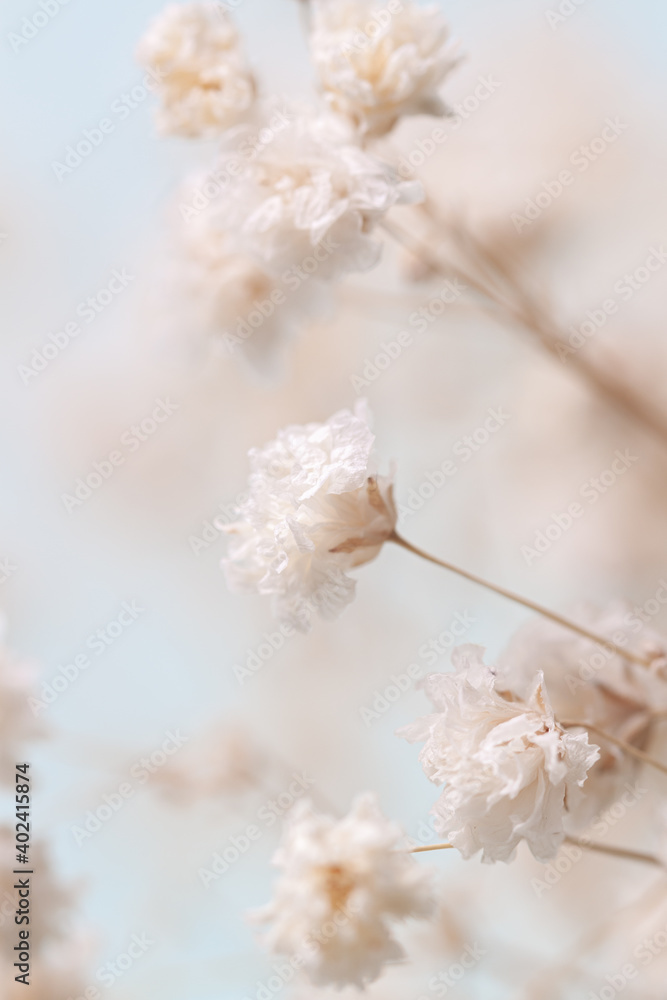 Obraz Białe Kwiaty - delikatne romantyczne suche małe białe kwiaty na jasnoniebieskim tle. Obrazy Canvas z motywem kwiatowym są świetną dekoracją pasującą w każdym wnętrzu. Kwiaty kochamy wszyscy, więc nie ulega wątpliwości, że takie dekoracje na ścianę będą wspaniałym dopełnieniem aranżacji. Plakaty, Obrazy Canvas z motywem kwiatowym dodadzą nutkę artyzmu i świeżości. Nasza bogata kolekcja ilustracji, grafik, fotografii Fine Art. i szkiców daje ogromne możliwości stworzenia wspaniałej galerii na ścianę, która doda przytulności i rozświetli wnętrze. Wszystkie Plakaty i Obrazy Canvas drukujemy w pełnej palecie kolorystycznej w najpiękniejszej jakości ADOBE RGB.