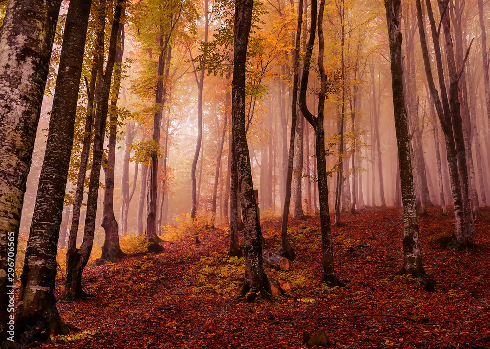 Beech autumn forest in the fog in the early morning. Gloomy fantastic magic forest. #296706565