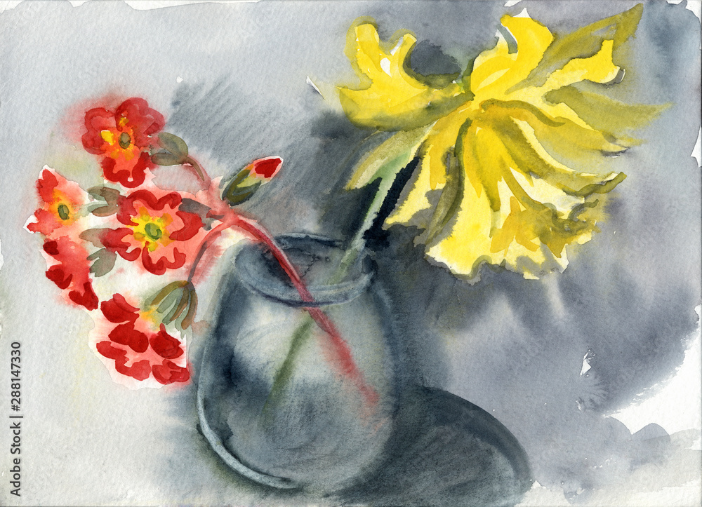 Plakaty i Obrazy Canvas z motywem kwiatowym - Szkic, akwarela, czerwony kwiatostan pierwiosnków i żółty żonkil Terry - są świetną dekoracją pasującą w każdym wnętrzu. Kwiaty kochamy wszyscy, więc nie ulega wątpliwości, że takie dekoracje na ścianę będą wspaniałym dopełnieniem aranżacji. Plakaty, Obrazy Canvas z motywem kwiatowym dodadzą nutkę artyzmu i świeżości. Nasza bogata kolekcja ilustracji, grafik, fotografii Fine Art. i szkiców daje ogromne możliwości stworzenia wspaniałej galerii na ścianę, która doda przytulności i rozświetli wnętrze. Wszystkie Plakaty i Obrazy Canvas drukujemy w pełnej palecie kolorystycznej w najpiękniejszej jakości ADOBE RGB.