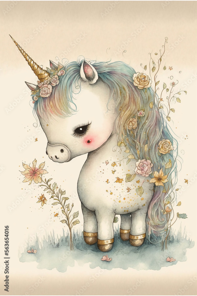 Obraz słodki jednorożec. Ilustracja jednorożca w kwiatach, piękna dekoracja na ścianę do pokoju dziecięcego. Obraz na płótnie, Plakat, Ilustracja do pokoju dziecka.