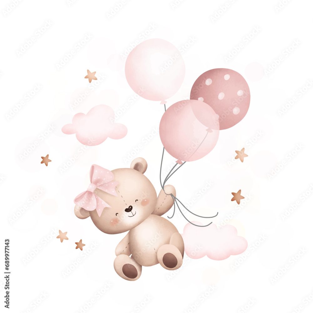 Watercolor Illustration cute teddy bear flying with balloons #689977143