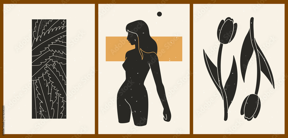 Zestaw trzech abstrakcyjnych minimalistycznych estetycznych Ilustracji z cienkimi liniami, kwiatowymi wzorami, roślinami, kobietą. Modne plakaty w stylu vintage boho.