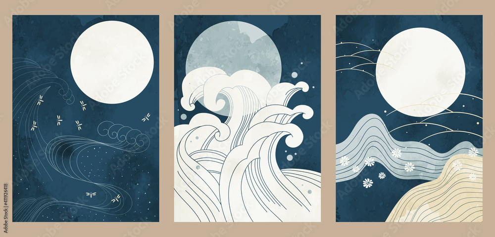 Plakaty w stylu Japońskim - plakaty nowoczesne. Zestaw trzech plakatów, akwarela z cienkimi liniami, falami, tradycyjnym wzorem, pełnią księżyca i kwiatami. Abstrakcyjna sztuka ścienna. Obraz na płótnie lub plakat w formie Tryptyku w rozmiarze 50/70 cm to nowoczesny zestaw dekoracyjny na ścianę.