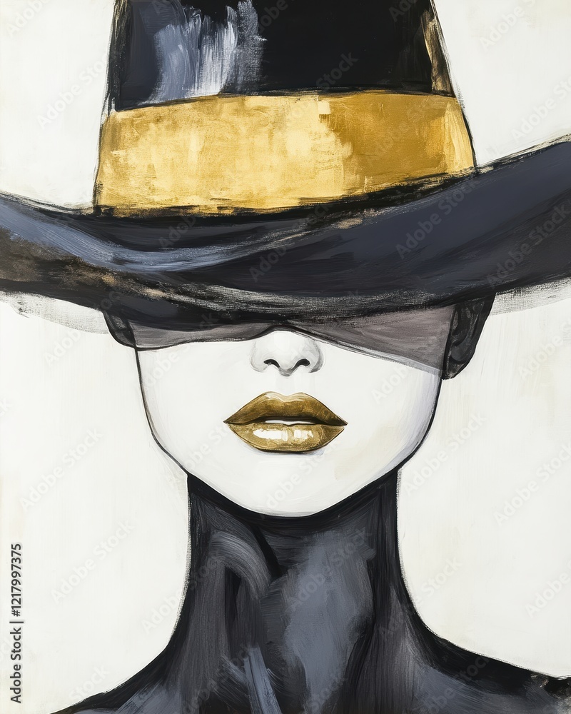Woman fashion outfit, hat, gold, art painting #1217997375